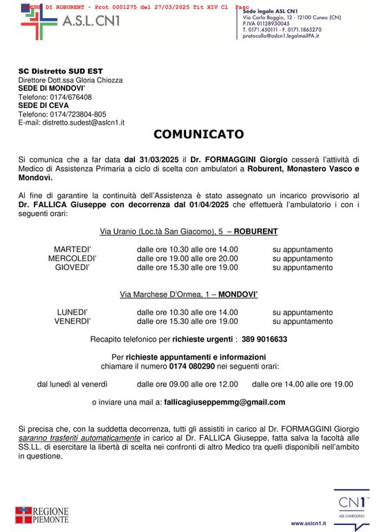 Il dottor Fallica distribuirà il proprio orario su tre giornate, di cui due nell’ambulatorio della frazione San Giacomo e, non appena verrà allestito il locale idoneo, ha dato disponibilità anche ad una presenza fissa settimanale a Roburent capoluogo.