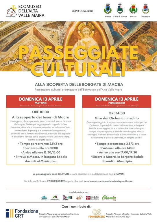 Ad aprile si riparte con le passeggiate culturali gratuite, alla scoperta delle borgate dei Comuni dell’Ecomuseo realizzate in collaborazione con le guide di Chamin. Quest'anno, a differenza delle scorse edizioni, ogni giornata sarà dedicata a un singolo Comune dell'Ecomuseo.