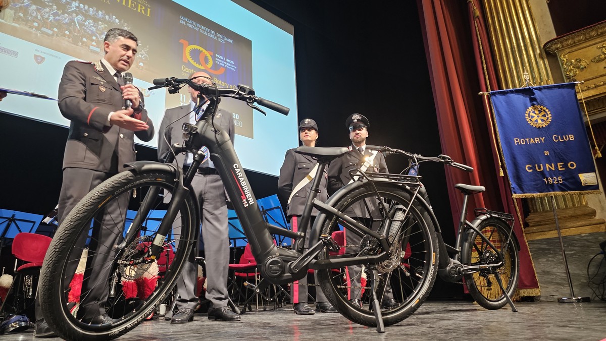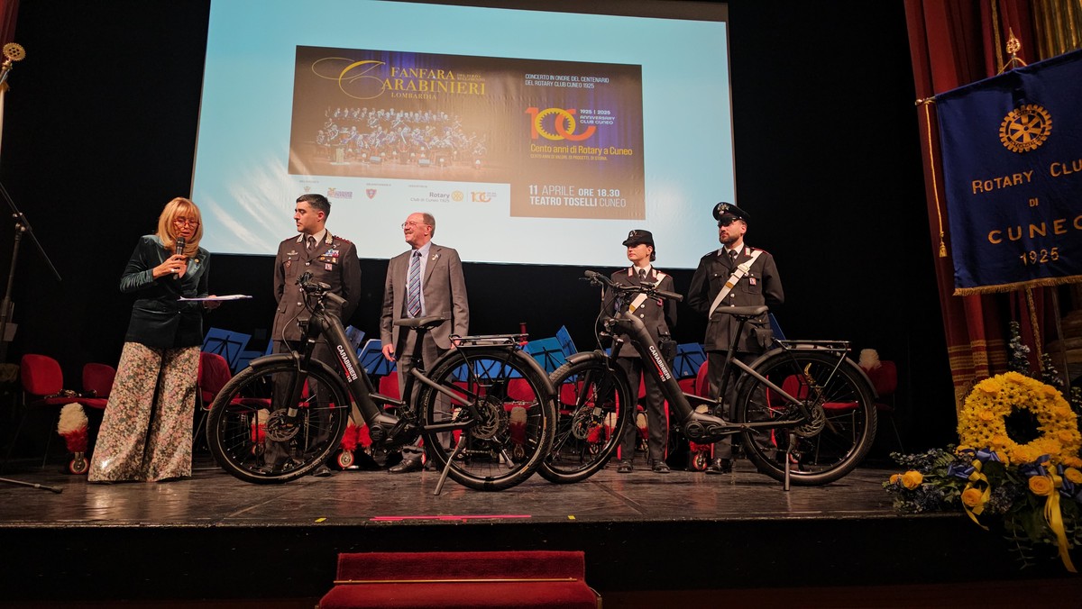 Durante la serata il presidente Luigi Fontana a nome del Rotary Cuneo ha donato al Comando provinciale dei Carabinieri di Cuneo, rappresentato dal colonnello Marco Piras, due biciclette a pedalata assistita.