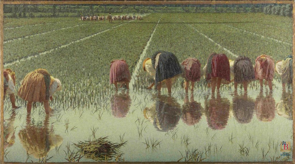 Angelo Morbelli, alessandrino, raccontò le difficili condizioni di lavoro nelle risaie. Il suo capolavoro, Per ottanta centesimi!, è una denuncia sociale intensa, ambientata tra le distese di riso del Monferrato e del Vercellese, mentre Giuseppe Pellizza da Volpedo, anch’egli alessandrino, diede vita a un’opera che sarebbe diventata un’icona del XX secolo: Il Quarto Stato, in cui il cammino degli operai verso un futuro più giusto, reso attraverso la tecnica divisionista, resta una delle immagini più potenti della storia dell’arte italiana.