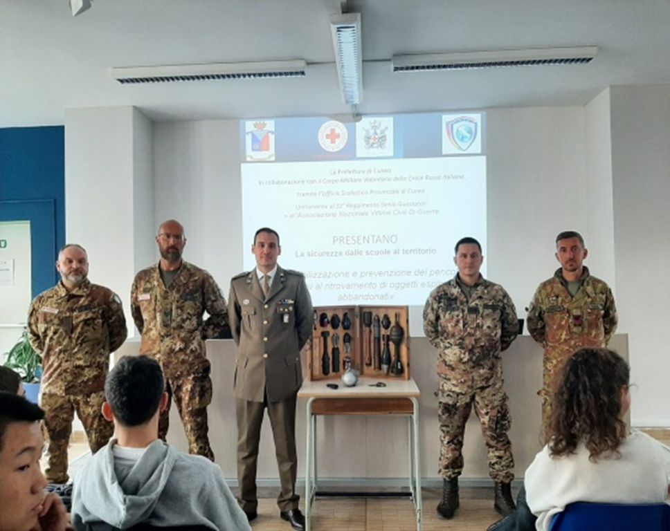 Dopo il saluto iniziale del Dirigente scolastico Ivan Re, alcuni rappresentanti del Corpo Militare della Croce Rossa Italiana e del 32° Reggimento Genio Guastatori di Fossano hanno mostrato agli allievi ordigni bellici di varie tipologie, al fine di poterli poi riconoscere in caso di ritrovamento, sottolineando come siano spesso resi quasi irriconoscibili dai segni del tempo, ma soprattutto hanno dato precise indicazioni su quale sia il comportamento da adottare in caso di rinvenimento di uno di essi. Questi manufatti possono essere molto pericolosi, pertanto non devono essere toccati o manomessi e bisogna denunciare immediatamente il ritrovamento segnalandone la posizione agli organi competenti.