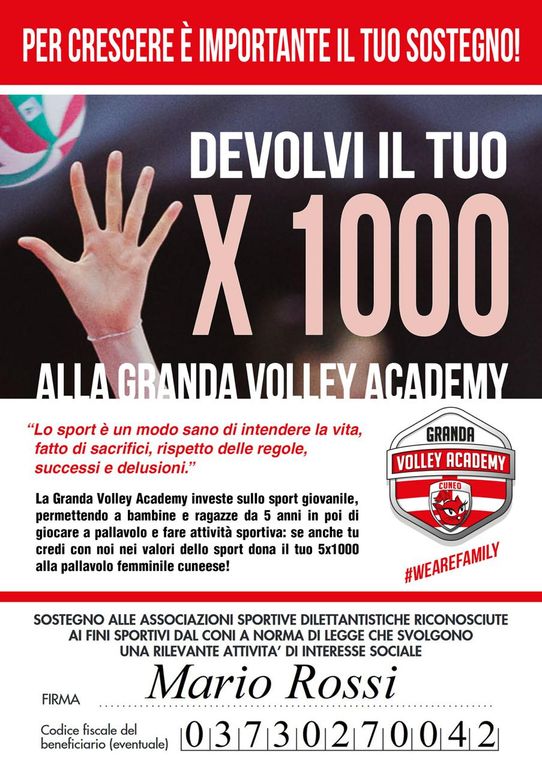 Per destinare il proprio 5x1000 alla Granda Volley Academy, è sufficiente comunicare il codice fiscale della società (03730270042) al proprio commercialista o al CAF al momento della dichiarazione.