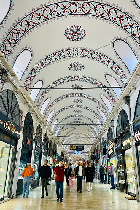 Una volta sulla riva europea, il tono cambia. La Moschea Blu, con le sue cupole armoniche, è nascosta da restauri che sembrano infiniti. Si intravede, come un volto dietro un velo. Poco distante, Santa Sofia racconta il passaggio della storia: chiesa, moschea, museo e di nuovo moschea. Oggi è accessibile solo dal piano superiore per i non musulmani. Il contrasto tra i fedeli in preghiera e i visitatori rumorosi dice molto del presente. Il pavimento in marmo, le calligrafie dorate, i mosaici bizantini creano un’atmosfera sospesa tra fede, arte e potere. Poi si scende, sotto terra, dove si nasconde una delle sorprese più emozionanti: la Basilica Cisterna. Le colonne si mostrano imponenti, la luce è tenue, l’atmosfera quasi mistica. Si ha l’impressione di entrare in un mondo parallelo, un luogo protetto, dove il tempo si è fermato. Le gocce d’acqua cadono dal soffitto ritmicamente e l’eco dei passi accompagna la visita, in un silenzio che parla. È uno dei luoghi più intimi della città, un invito alla lentezza, alla riflessione. Qui Istanbul non si mostra, si lascia sentire. Il Gran Bazar, con le sue cupole e i suoi corridoi affollati, oggi è più una scenografia che un mercato vivo. Ha perso parte delle sue origini. Le voci autentiche si confondono con i richiami costruiti per il turista, i prezzi sono gonfiati, le contrattazioni spesso inscenate. È un luogo che affascina più per la sua architettura che per la sua funzione: uno spettacolo visivo, più bello da vedere che da vivere.