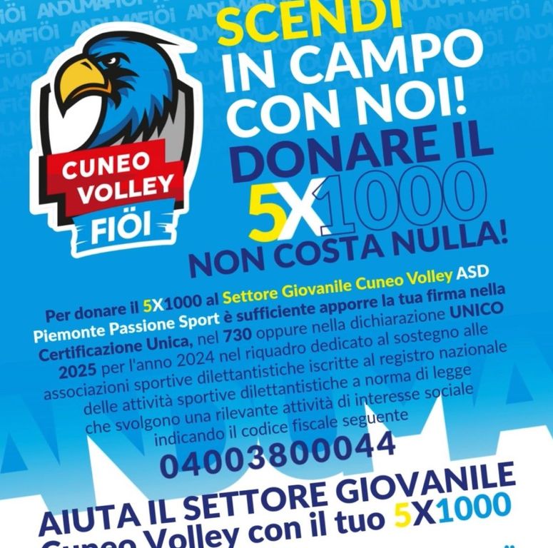 Destinando il tuo 5x1000 al settore giovanile del Cuneo Volley, darai un sostegno concreto alla crescita di nuovi talenti e alla diffusione dei valori fondamentali che lo sport insegna ogni giorno: rispetto, impegno, spirito di squadra e passione.