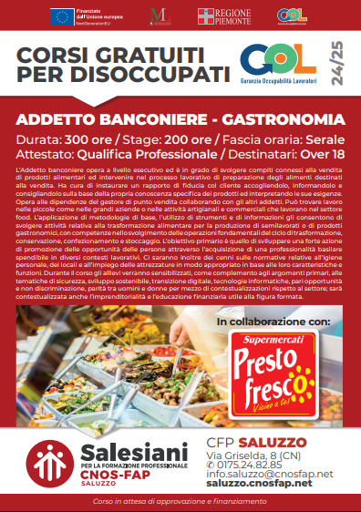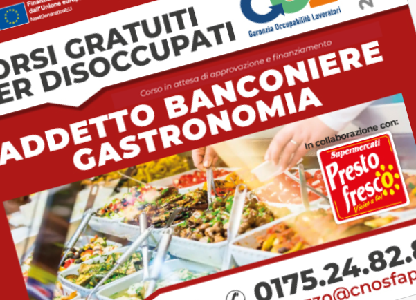 Se sei un adulto disoccupato (maggiorenne) in cerca di una nuova opportunità lavorativa, questo è il momento giusto per rimetterti in gioco. Il nostro corso gratuito di qualifica per Banconiere di Gastronomia, finanziato dalla Regione Piemonte, dall’Unione Europea e dal Bando GOL (Garanzia di Occupabilità dei Lavoratori), è pensato appositamente per aiutarti a costruire un nuovo percorso professionale in un settore con molta richiesta di inserimento lavorativo.
