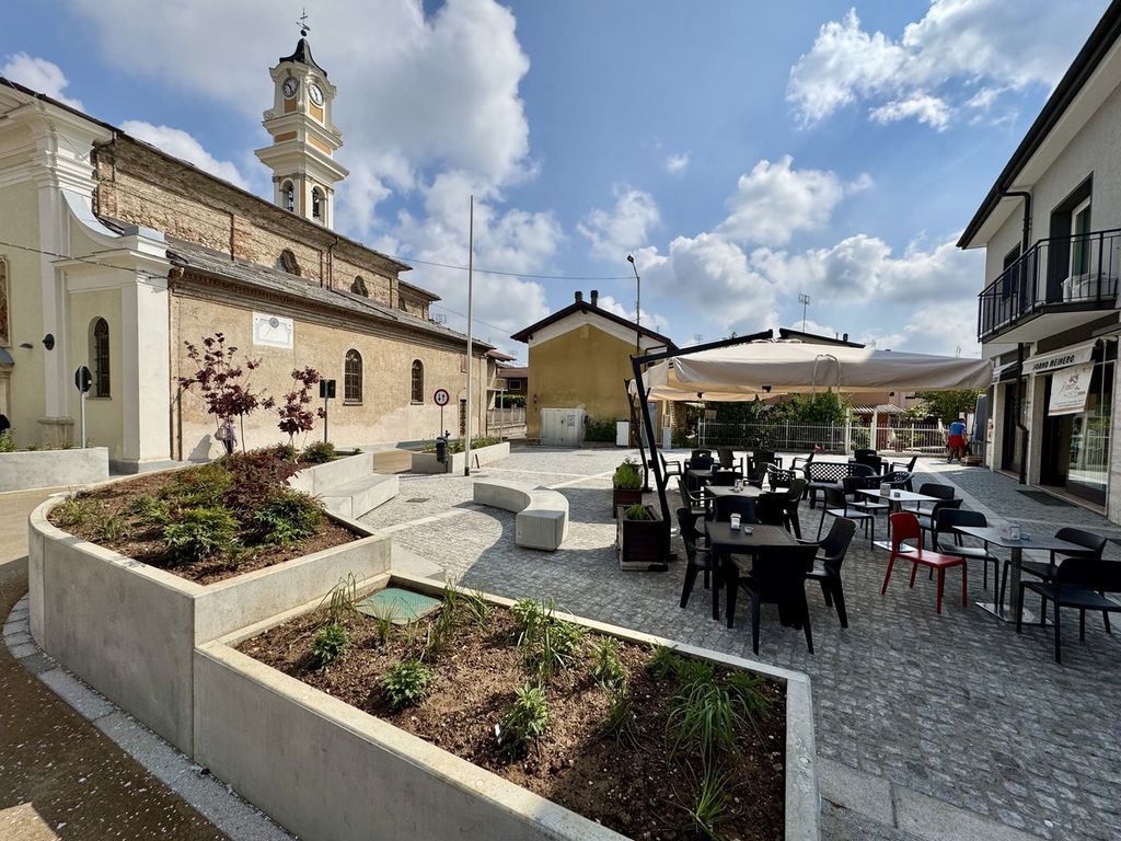 Ora lo spazio tra le attività commerciali e la chiesa non è più una semplice e pericolosa area di transito ma una vera e propria piazza dove poter camminare e socializzare in tranquillità. Qui porfido ha preso il posto dell’asfalto, che è stato rifatto invece nella sede stradale con un color “terra” e rialzato in modo da creare una piazza traversante per indurre le auto a rallentare. Agli angoli sono state installate delle fioriere di cemento che rendono più sicuro l’incrocio e consentono una piacevole sosta grazie alle panchine e alle essenze piantumate e curate a proprie spese dall’Agriturismo Tetto Garrone. Così come è stato allargato il marciapiede a valle della chiesa grazie alla collaborazione della parrocchia, che ha ceduto 21 metri in lunghezza.