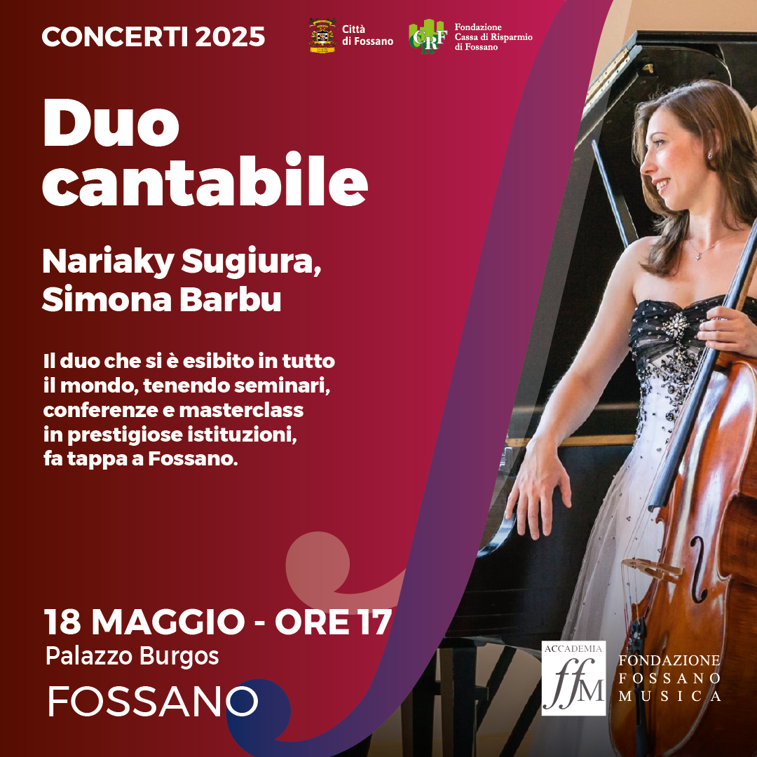 Prosegue la rassegna “Domenica, Musica!” della Fondazione Fossano Musica con un evento di rilevanza internazionale: domenica 18 maggio alle ore 17, presso la Sala Grande Giovanni Mosca di Palazzo Burgos, il pubblico avrà l’opportunità di ascoltare il Duo Cantabile, formato dalla violoncellista Simona Barbu e dal pianista Nariaki Sugiura, entrambi affermati concertisti e docenti presso la University of North Dakota (USA).