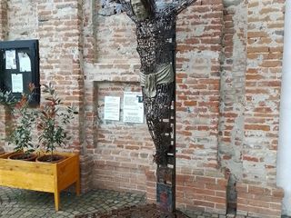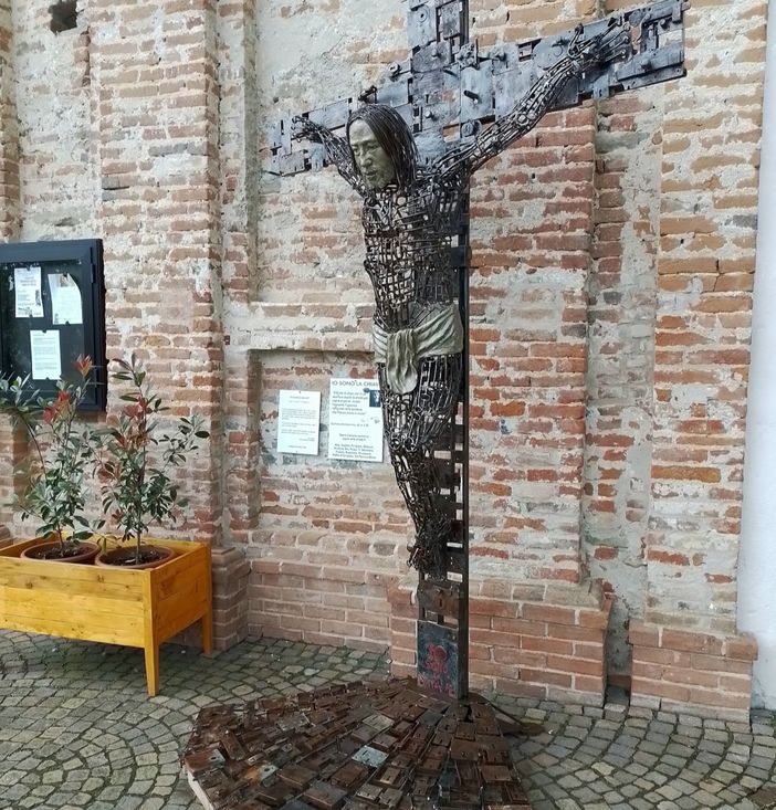Si tratta di una crocifissione, realizzata con chiavi e lucchetti, alta più di tre metri che, negli ultimi mesi, ha fatto tappa in diverse zone della Granda, da Fossano a Bra.