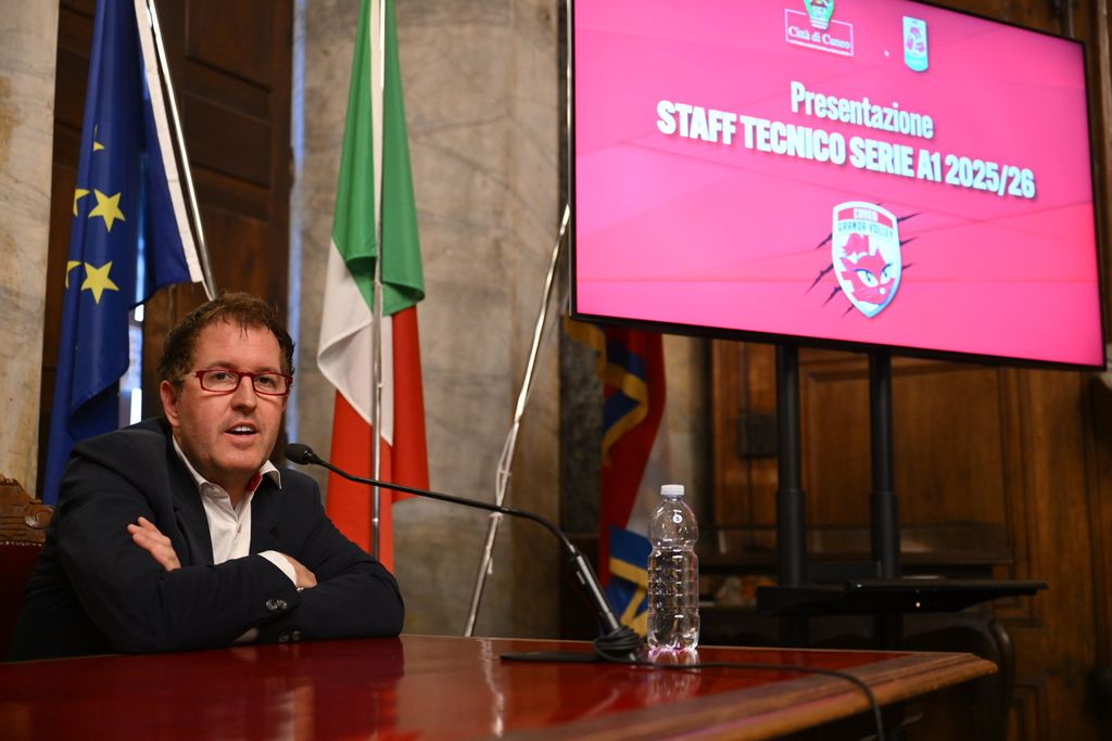 La Cuneo Granda Volley comincia a prendere forma in vista della stagione 2025-2026. Dopo i primi annunci di mercato, ieri pomeriggio (giovedì 15 maggio) la società biancorossa ha presentato lo staff tecnico, dando così ufficialmente il via alla nuova annata sportiva. L’evento si è svolto nella suggestiva Sala d’Onore del Comune di Cuneo, cornice istituzionale ed elegante che ha accolto autorità, sponsor, stampa e tifosi.