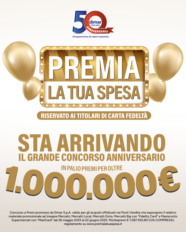 Il concorso, rivolto a tutti i possessori della carta fedeltà Mercatò e Maxisconto, rappresenta il cuore pulsante delle celebrazioni dell’anniversario, dichiarano Simona e Alessandro Revello, rispettivamente Presidente e Amministratore Delegato di Dimar S.p.A.: “Il concorso nasce proprio per i nostri Clienti, come segno concreto di riconoscenza per la fiducia dimostrata in questi anni. Abbiamo pensato ad un’iniziativa coinvolgente, un’occasione per restituire valore, rafforzare il legame costruito nel tempo e rinnovare l’impegno verso chi continua a sceglierci ogni giorno”.