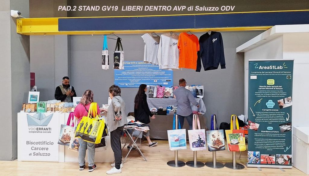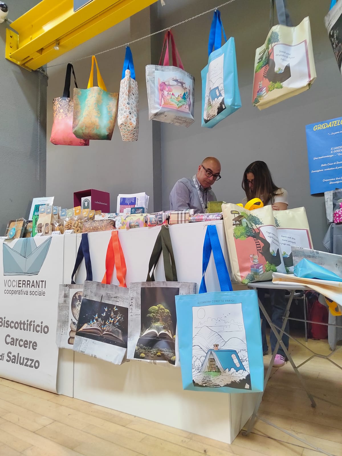 Un secondo stand, quello di Liberi Dentro, Associazione di Volontariato Penitenziario – ODV, presente nella Casa di Reclusione di Saluzzo che, unitamente alla Cooperativa Sociale Voci Erranti e all’Associazione Idee in Movimento, propone e collabora in alcuni dei percorsi rieducativi presenti a Saluzzo e che, con la presenza per il secondo anno consecutivo alla prestigiosa manifestazione culturale torinese, ha dato continuità ai progetti di lavoro e di istruzione presenti in carcere.