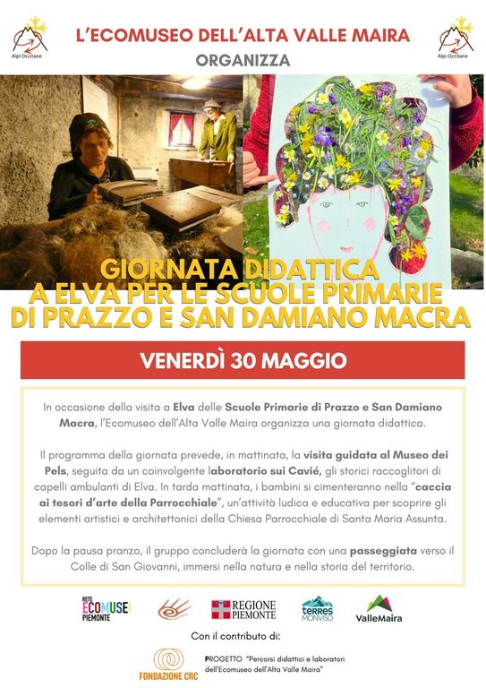 Venerdì 30 maggio le classi delle Scuole Primarie di Prazzo e San Damiano Macra parteciperanno a una giornata didattica dedicata al borgo di Elva e alle sue peculiarità culturali e storiche, organizzata dall’Ecomuseo dell’Alta Valle Maira.