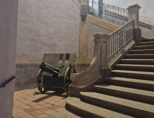 Da alcuni giorni, lo scalone monumentale di Palazzo Giriodi si arricchisce di un nuovo elemento di grande valore storico e simbolico: un prezioso e raro esemplare di cannone 76/17 Schneider, risalente alla Prima Guerra Mondiale.