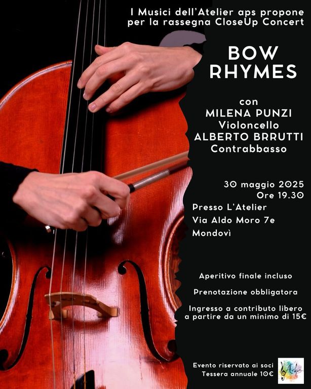 Mondovì si prepara ad accogliere un evento musicale d’eccezione: “Bow Rhymes”, il concerto che vede protagonisti Milena Punzi al violoncello e Alberto Brutti al contrabbasso, sarà presentato venerdì 30 maggio 2025 alle ore 19:30presso L’Atelier, in Via Aldo Moro 7e. L’iniziativa rientra nella rassegna CloseUp Concert, proposta dall’associazione I Musici dell’Atelier aps, e promette un’esperienza sonora fuori dal comune.