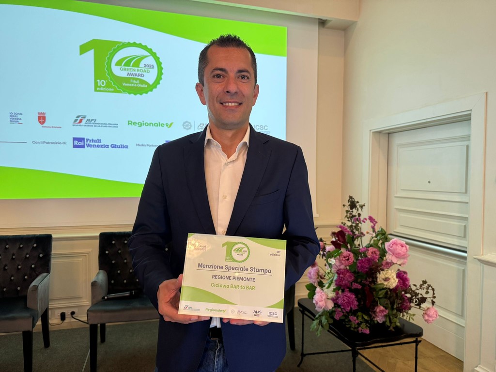 Nel decennale del “Green Road Award - Oscar italiano del Cicloturismo”, la Regione Piemonte ha ricevuto la Menzione speciale della stampa per la ciclovia Bar to Bar, l’itinerario ad anello tra Barbaresco e Barolo che unisce sport, paesaggio e cultura nelle colline Patrimonio Unesco di Langhe, Roero e Monferrato. A ritirare il riconoscimento in rappresentanza della Regione è stato l’assessore ai Trasporti e Opere pubbliche Marco Gabusi.