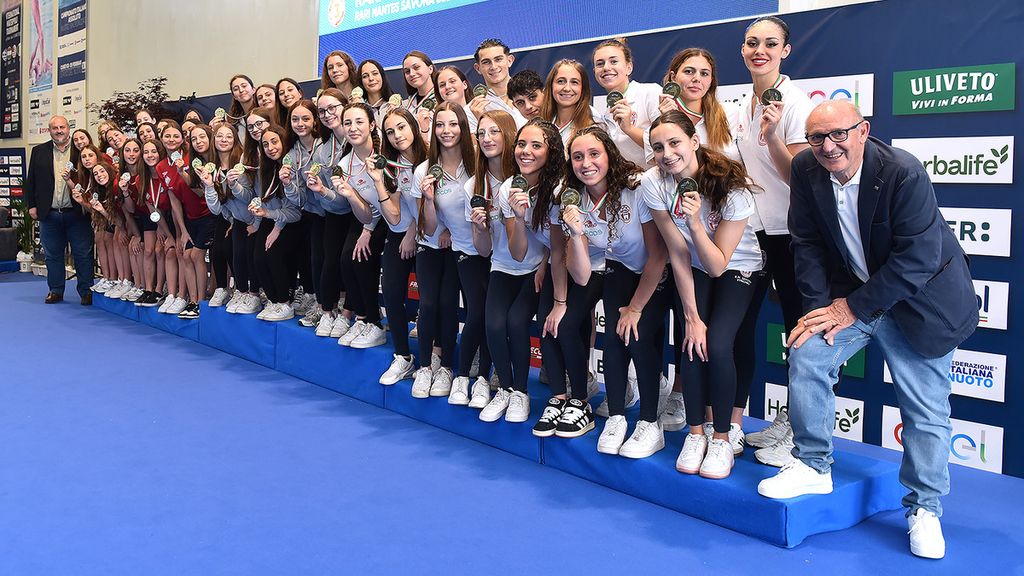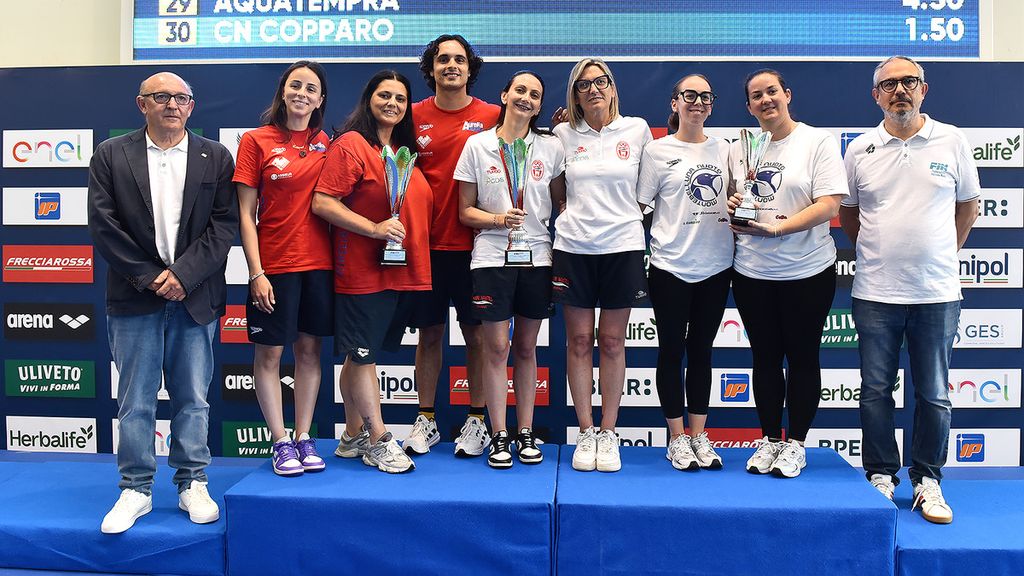 La Rari Nantes Savona si aggiudica la classifica di società con 989 punti, accompagnata sul podio da Aurelia e Montebelluna. Braccia al cielo per il team della Città Sport Vicenza, già davanti a tutti nel preliminare di sabato, che si aggiudica il titolo di campione d’Italia a squadre toccando quota 266.0000 punti, in crescita anche rispetto all’esibizione di 24 ore prima (261.2877). Un risultato importante per le dodici ragazze allenate da Rossana Rocci (le otto titolari e le quattro riserve) che dimostrano di aver raggiunto l’obiettivo dell’alto livello. Dietro di loro ci sono team di società blasonate come l’Aurelia Nuoto, con le sorelle Cupaioli che si rialzano dopo la delusione nel doppio (con un ritardo di 1.1760) e la Rari Nantes Savona (3.2286 punti dietro).