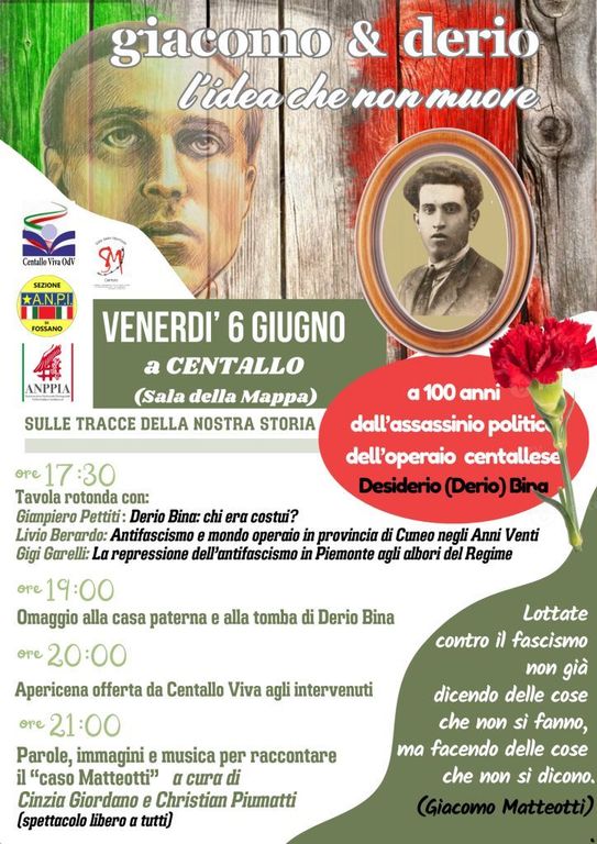 Venerdì 6 giugno ne parleranno in una tavola rotonda, a partire dalle 17,30 in sala della Mappa, Gianpiero Pettiti e gli storici Livio Berardo e Gigi Garelli. Pettiti riferirà sull’esito della ricerca compiuta in questi mesi per cercare di delineare i contorni biografici della figura di Bina, mentre i due storici parleranno dei rapporti tra antifascismo e mondo operaio nel cuneese (Livio Berardo) e sulla repressione dell’antifascismo in ambito piemontese (Gigi Garelli). Seguirà alle 19 un omaggio alla casa natale e alla tomba di Derio Bina, quindi alle 20 un apericena offerto da Centallo viva. Alle 21, Cinzia Giordano e Christian Piumatti offriranno uno spettacolo di parole, immagini e musica per raccontare il “caso Matteotti”, a cui si lega a doppio filo la figura dell’operaio centallese, anch’egli vittima di un assassinio politico, compiuto ad un anno esatto da quello del coraggioso deputato socialista e per di più nel suo nome e “a causa sua”. Se così dicendo è stata suscitata la curiosità di qualcuno, sarà possibile appagarla partecipando ad una serata che si preannuncia “diversa” sotto tanti aspetti (l’ingresso, ovviamente, è libero, secondo la migliore tradizione di Centallo Viva).