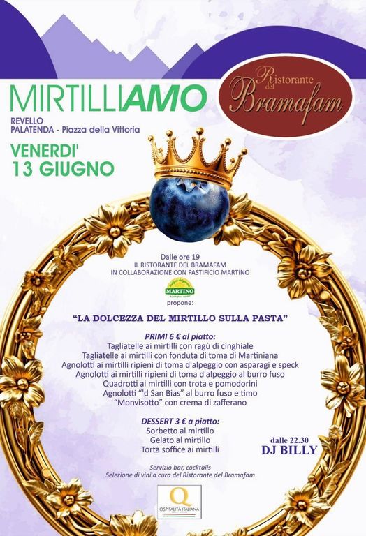 A partire dalle ore 19, il Palatenda si trasformerà in un tempio del gusto con una proposta gastronomica incentrata su primi piatti che celebrano il mirtillo in abbinamenti originali e raffinati. Il menu, curato dal Ristorante del Bramafam, in collaborazione con il Pastificio Martino di Rifreddo, propone una selezione di piatti a base di pasta fresca del Pastificio Martino, pensati per esaltare la dolcezza e la versatilità di questo frutto.