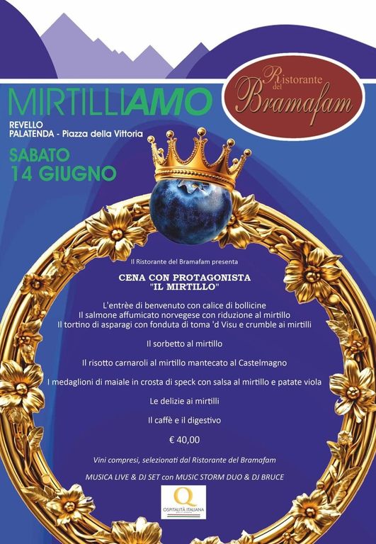 La seconda serata di Mirtilliamo, sempre al Palatenda di Piazza della Vittoria, vedrà il Ristorante del Bramafam proporre una cena completa dedicata al mirtillo, al costo di 40 euro a persona, vini inclusi. Un’esperienza gastronomica raffinata che esalta il frutto in ogni portata, dalla entrée al dessert.