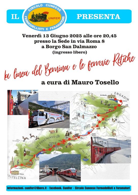 L’appuntamento è per venerdì 13 giugno alle ore 20.45, con una presentazione dedicata alla suggestiva linea ferroviaria del Bernina e alle Ferrovie Retiche. Un viaggio tra immagini, storia, tecnica e turismo che saprà affascinare sia gli esperti del settore che i semplici curiosi.