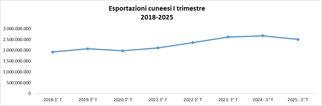 Le vendite all’estero dei prodotti made in Cuneo nel trimestre gennaio-marzo 2025 hanno superato i 2,5 miliardi di euro, registrando una flessione del 6,5% rispetto allo stesso periodo del 2024; il valore delle importazioni sfiora gli 1,5 miliardi di euro (con un aumento del 7,3%). Il saldo della bilancia commerciale si è attestato a 1.013 milioni di euro registrando un -21,3% rispetto al periodo gennaio-marzo 2024.