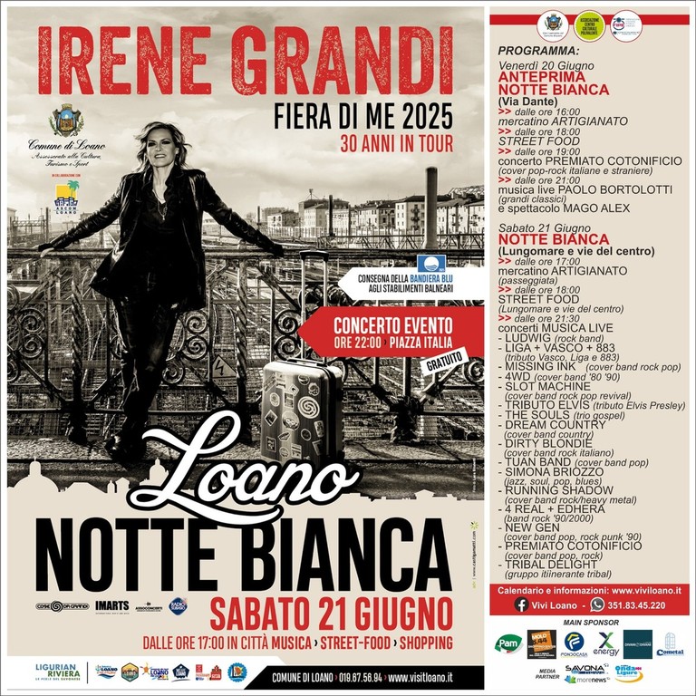Sabato 21 giugno la festa esploderà in tutto il centro cittadino con la vera e propria Notte Bianca, che animerà il lungomare e le vie del centro con un programma ricchissimo. Dalle ore 17, la passeggiata si trasformerà in un suggestivo mercatino dell’artigianato, ideale per chi ama scoprire pezzi unici e idee regalo. Alle 18, il profumo dello street food si diffonderà per le vie della città, con tantissime proposte gastronomiche pronte a soddisfare ogni palato. Dalle 21:30, Loano si trasformerà in un grande palcoscenico a cielo aperto, completamente gratuito, con concerti e musica live che animeranno la serata fino a notte fonda.