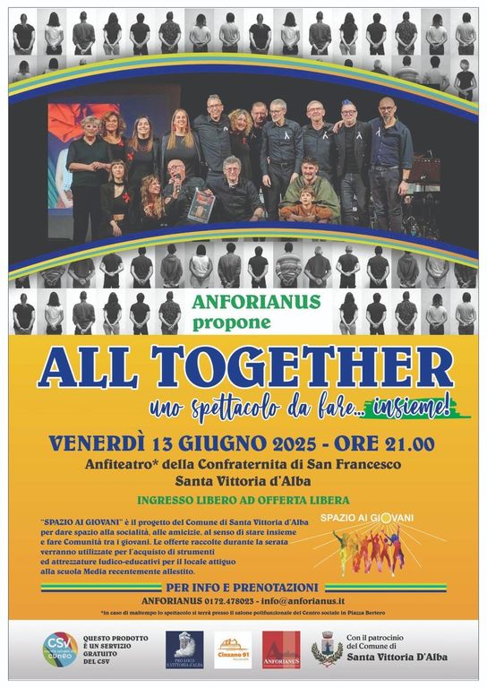 “All Together - Uno spettacolo da fare insieme!", in programma per il 13 giugno 2025 a Santa Vittoria d'Alba, promosso dall'Associazione Anforianus Odv con il patrocinio del Comune di Santa Vittoria d’Alba e la collaborazione della Pro Loco Santa Vittoria d’Alba e della Proloco Cinzano 91APS, con il prezioso sostegno del “CSV Società Solidale” di Cuneo, rappresenta non solo un’occasione di svago, ma un’esperienza educativa e formativa. Il coinvolgimento degli artisti volontari del gruppo “Tut a Post” e la partecipazione di ragazzi e famiglie dimostrano quanto la passione, la gratuità e il desiderio di creare connessioni umane possano generare bellezza e ispirazione. Iniziative di questo tipo meritano di essere sostenute e replicate, perché contribuiscono a costruire una società più coesa, creativa e solidale.