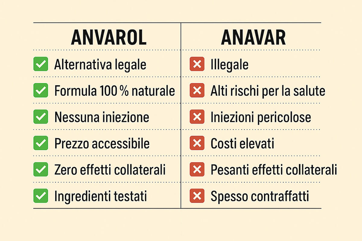Per chi cerca risultati senza rischi per la salute, multe o conseguenze legali, le alternative testate come l'Anvarol offrono un compromesso vantaggioso: pur non eguagliando l’Oxandrolone milligrammo per milligrammo, l’Anvarol garantisce i 4/5 dei benefici sulla massa magra senza ripercussioni sul sistema endocrino, ansia doganale e piena trasparenza dei prezzi.