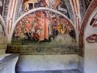 donazione economica e alla committenza dei feudatari del luogo, Giacomo e Gioffredo Saluzzo – Valgrana, i quali vollero, all’interno, uno straordinario intervento decorativo, con un ciclo di affreschi affidato allo studio e alle mani del più importante pittore di quegli anni nell’area del Marchesato.