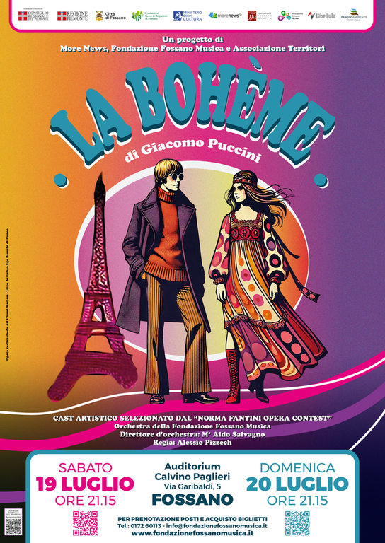 La locandina accompagna l’allestimento dell’opera La bohème, che andrà in scena sabato 19 luglio alle ore 21:00 presso l’Auditorium Calvino-Paglieri di Fossano (CN), nell’ambito del Norma Fantini Opera Contest: un evento reso possibile grazie alla sinergia tra l’Associazione Culturale Territori, More News e Fondazione Fossano Musica.