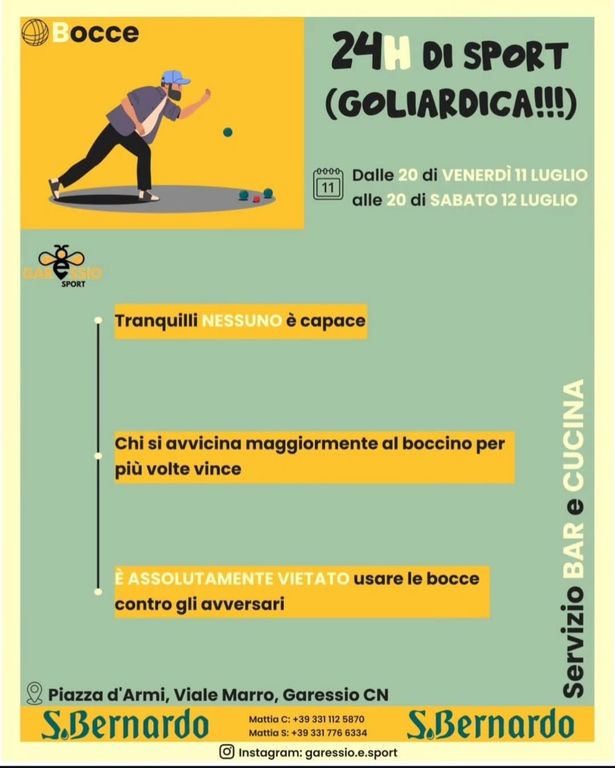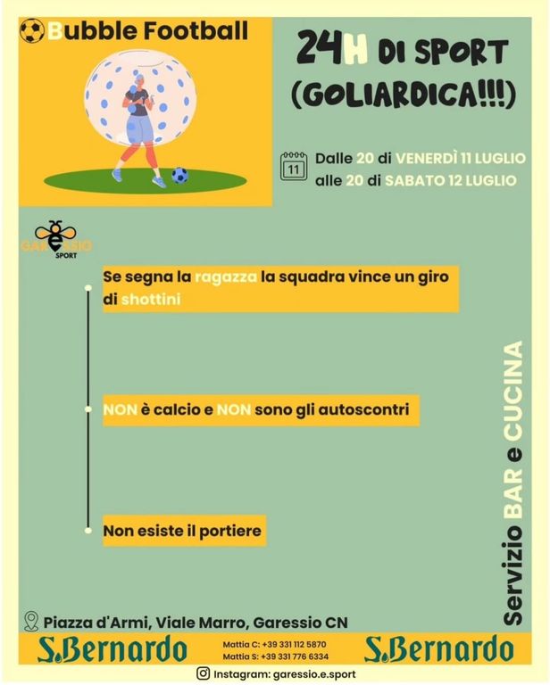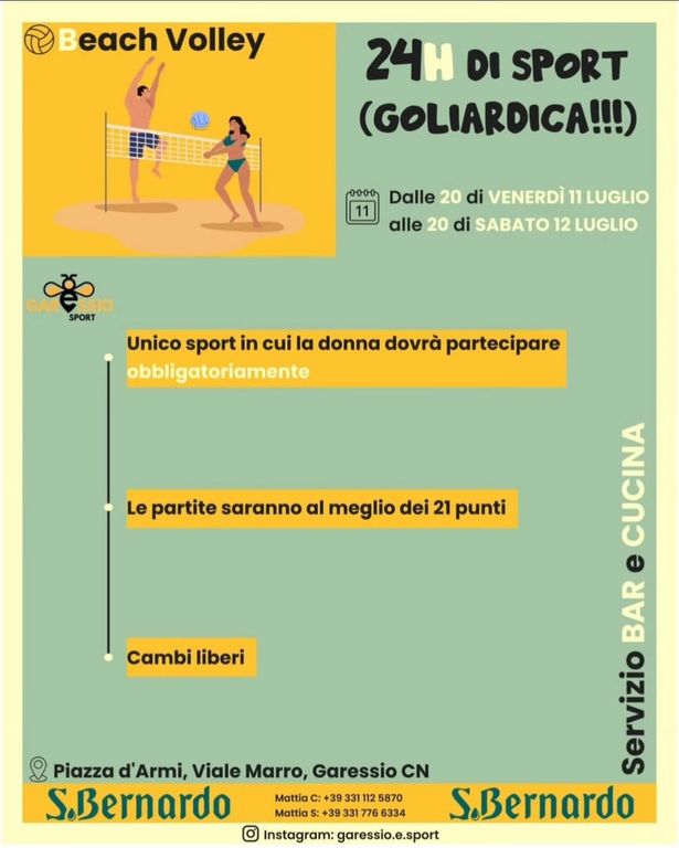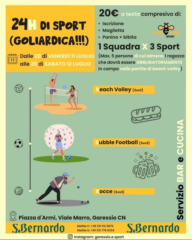 Ma l’estate sportiva garessina non si ferma qui: il prossimo grande appuntamento è fissato per l’11 e 12 Luglio, con la spettacolare 24 Ore di Sport presso Piazza d’Armi. Un’intera giornata (e notte!) all’insegna del movimento, del gioco e della condivisione, dove tutti potranno essere protagonisti.