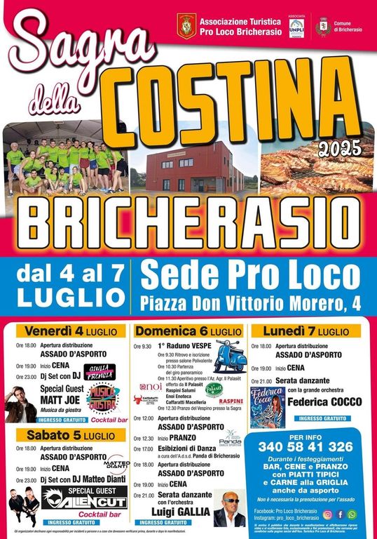 La sede della Pro loco di Bricherasio (piazza don Vittorio Morero 4) si prepara ad accogliere un appuntamento imperdibile per buongustai e amanti della festa: da venerdì 4 a lunedì 7 luglio torna la Sagra della Costina, organizzata dall'associazione con il patrocinio del Comune.