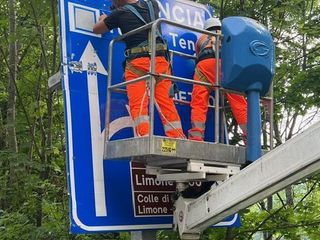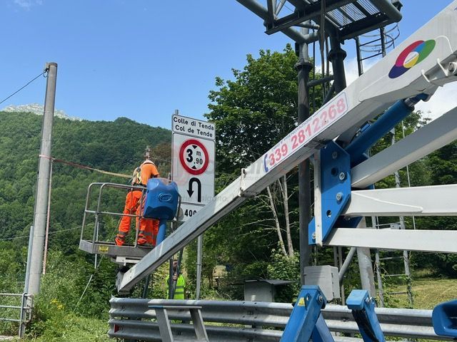 Lassù, al colle, si lavora alacremente. Uomini e mezzi, mezzi e uomini. Si testa il semaforo lato Italia, si taglia l'erba lungo i cigli della Statale 20, si rimette mano alla segnaletica. Quella segnaletica che, per quasi cinque anni, non ha più indicato la possibilità di raggiungere la Francia dalla valle Vermenagna.