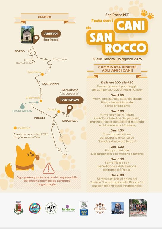 L’evento, che unisce il piacere della camminata alla devozione popolare per San Rocco – protettore degli animali e dei pellegrini – invita tutti i partecipanti a percorrere insieme ai loro cani un suggestivo itinerario di circa 7 km attraverso le colline e le borgate del territorio. La partenza è prevista dalla zona sportiva di Niella Tanaro, con arrivo alla cappella dedicata al Santo per la benedizione degli animali.