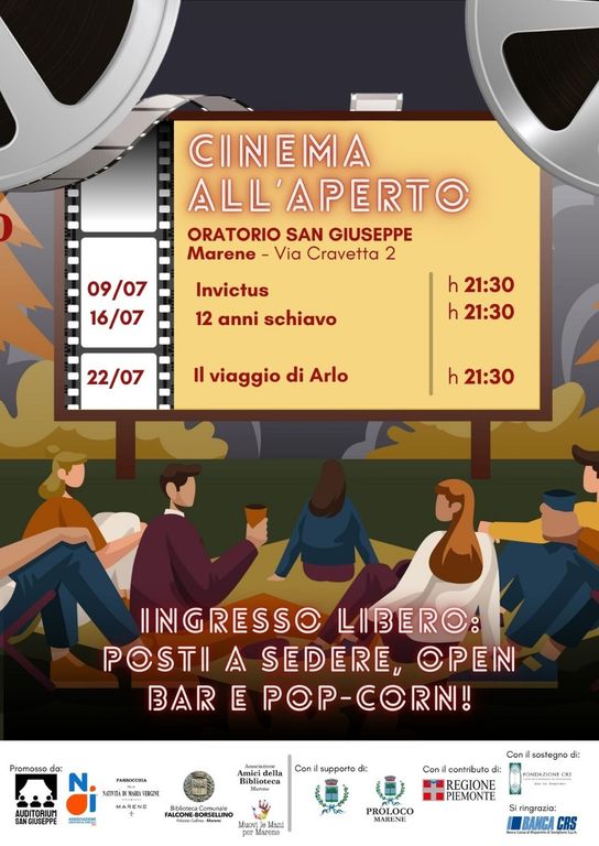 Anche quest’anno a Marene torna il Cinema all’Aperto. Grazie all’impegno del Gruppo di lavoro che valorizza l’Auditorium San Giuseppe a luglio il campo della Parrocchia si trasformerà in una grande sala cinematografica dove incontrarsi, mangiarsi un pacchetto di popcorn e vedersi un bel film insieme nei seguenti giorni sempre alle ore 21,30: