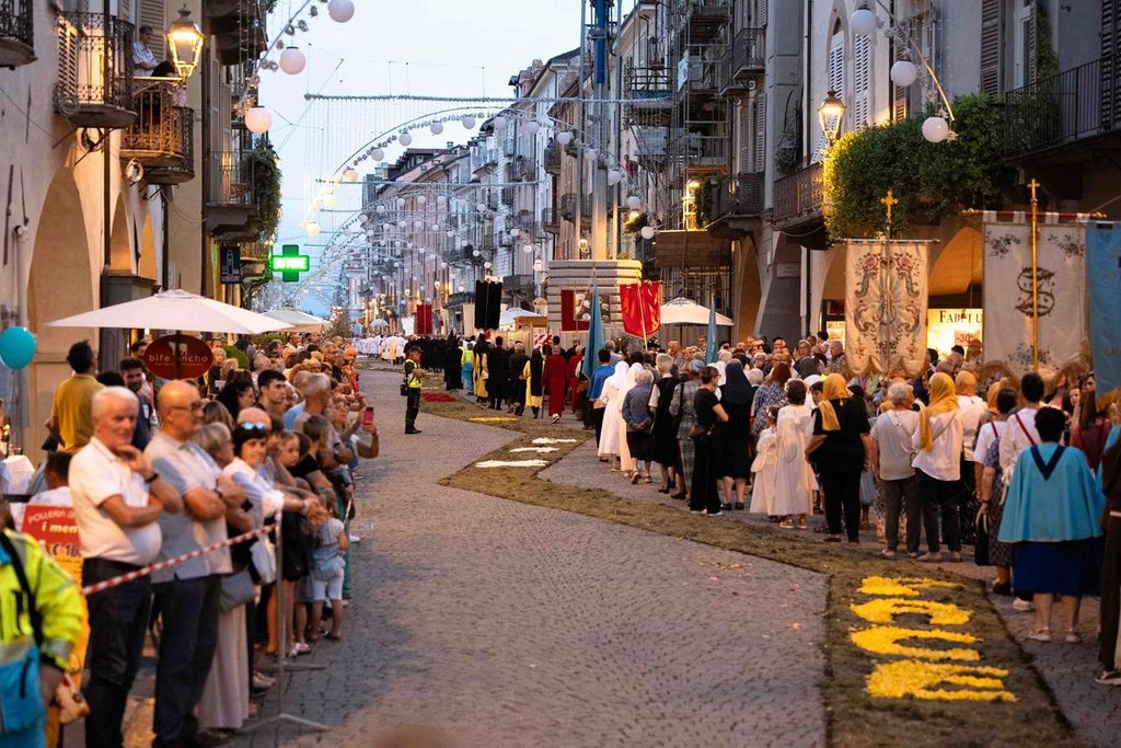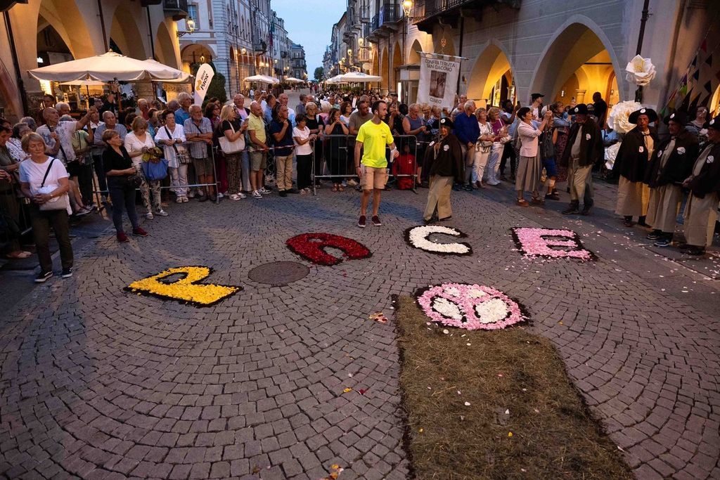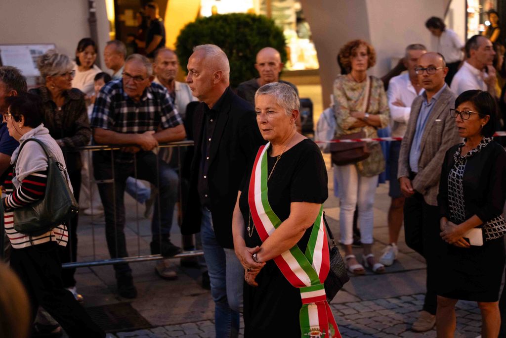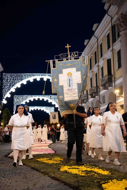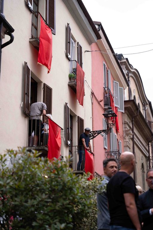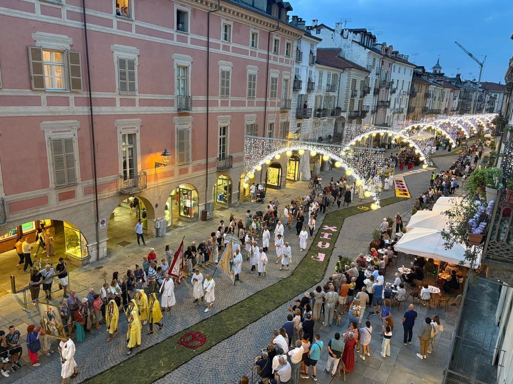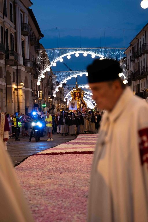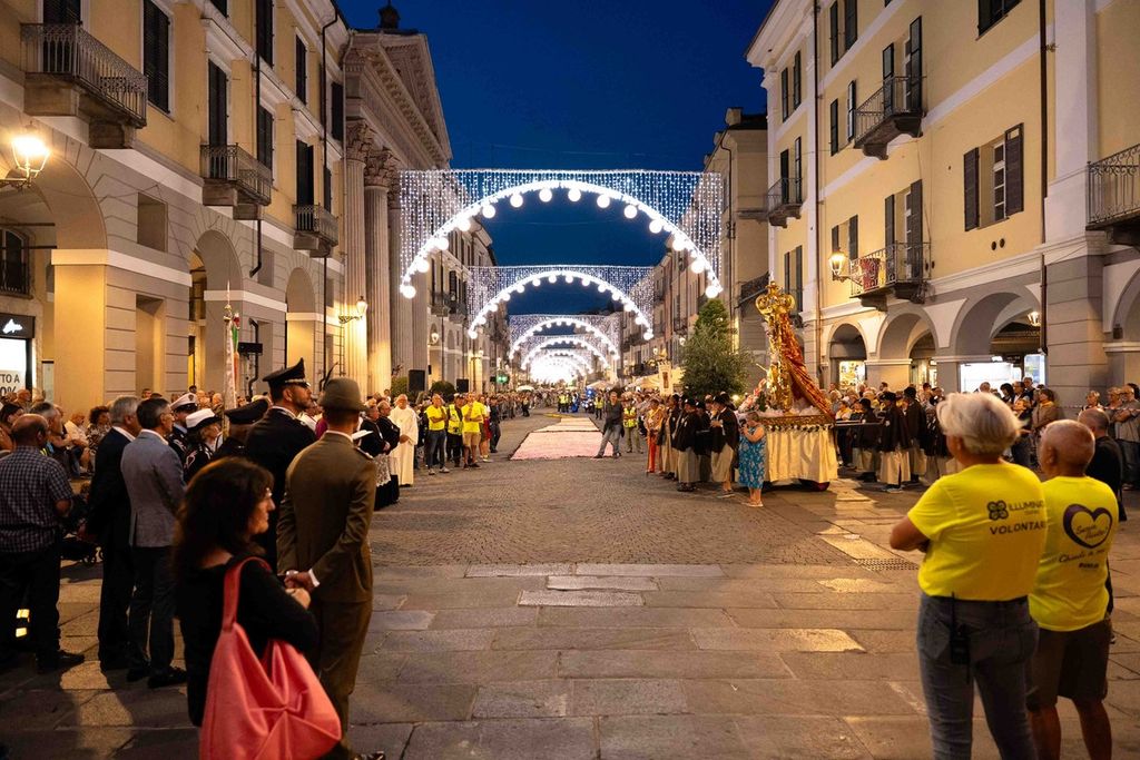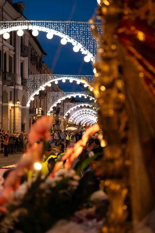 La statua della Madonna ha attraversato via Roma e si è fermata in piazza Galimberti, dove è stato reso omaggio dalle autorità civili e religiose. Al passaggio, dai balconi addobbati con drappi rossi sono stati lanciati petali di rosa sul corteo, simbolo di devozione e partecipazione popolare.
