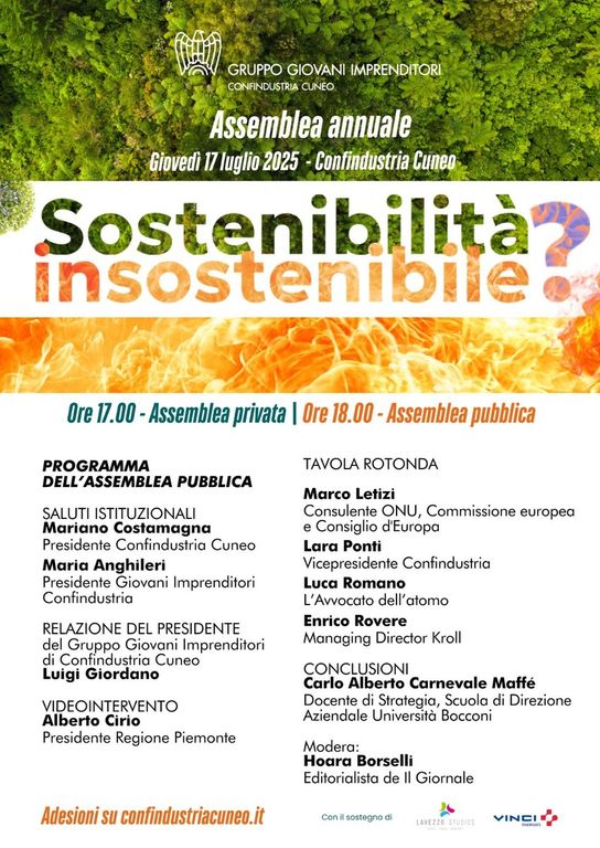 Giovedì 17 luglio dalle 18, presso la sede di Confindustria Cuneo (via Vittorio Bersezio 9, Cuneo) si terrà l’assemblea pubblica annuale del Gruppo Giovani Industriali cuneese dal titolo “Sostenibilità insostenibile?”, una riflessione a più voci sul tema della sostenibilità e del suo impatto trasversale.