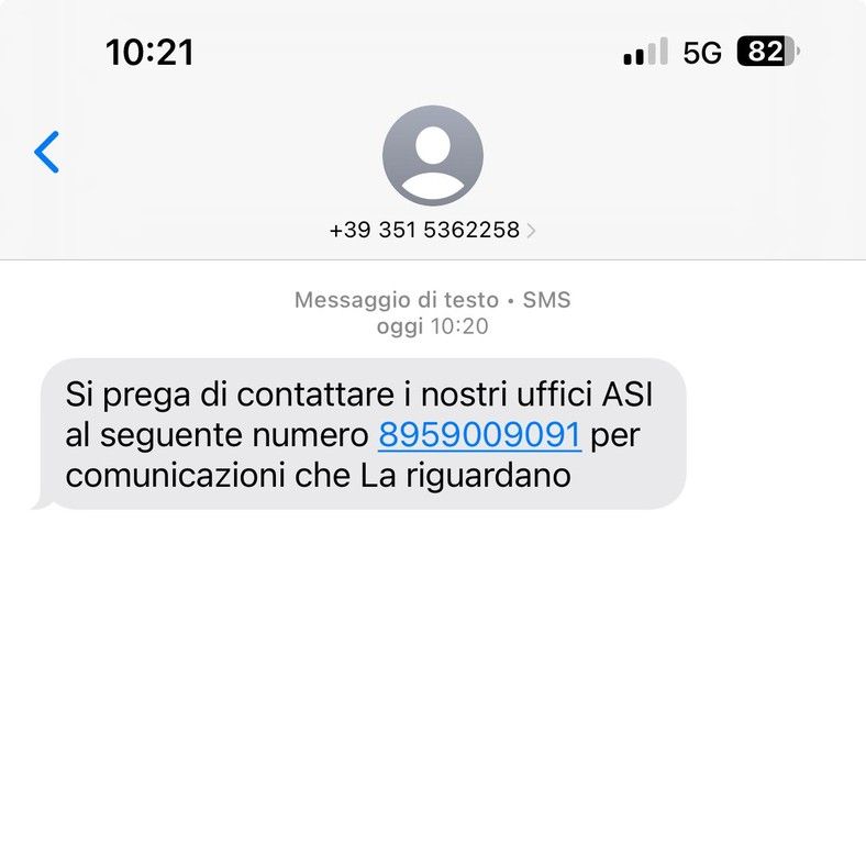 Sta circolando in queste ore un SMS sospetto che diversi cittadini hanno ricevuto sui propri telefoni cellulari. Il messaggio invita a contattare presunti “uffici ASI” al numero 895..., sostenendo che vi siano “comunicazioni che La riguardano”.