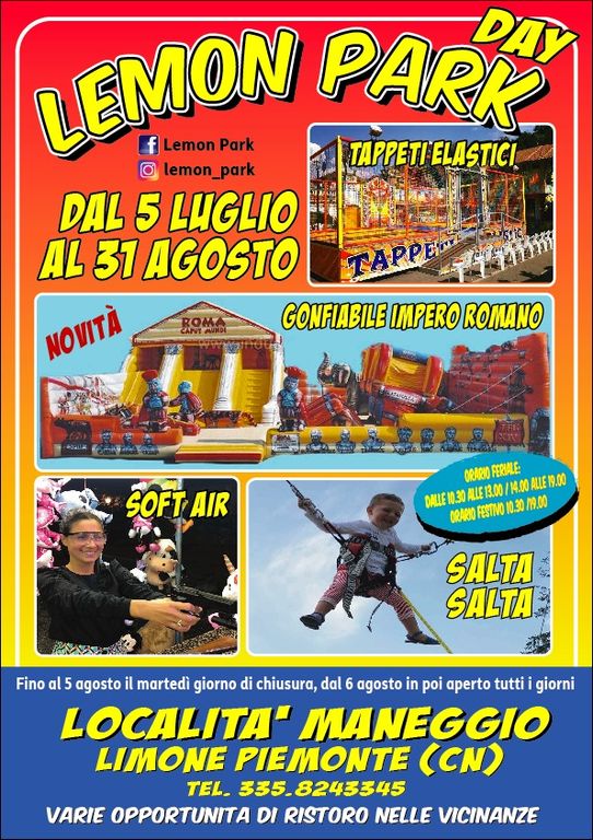 Situato nella suggestiva località Maneggio di Limone Piemonte (Via San Giovanni 36), Lemon Park si conferma anche quest’anno una delle mete più apprezzate da residenti e turisti, grazie a una proposta pensata per grandi e piccoli, con attrazioni sicure, aree verdi, ristori e una grande novità che ha già fatto il giro dei social: il maxi gonfiabile “Roma Caput Mundi”.