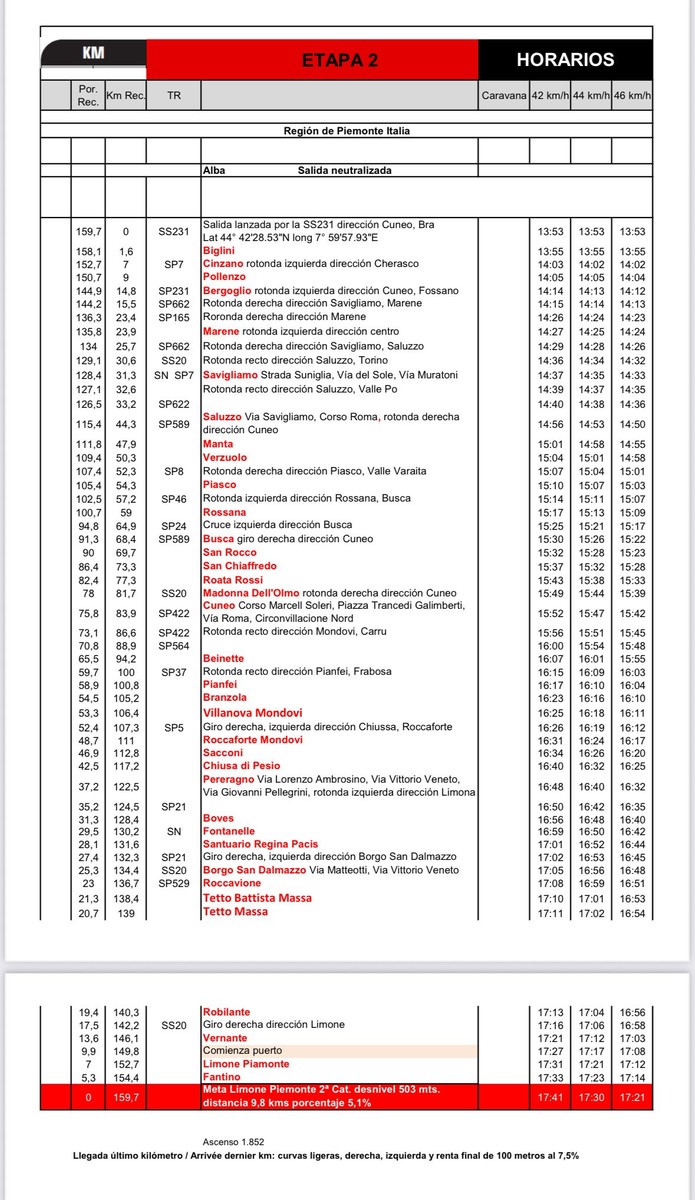 Nella mattinata ci sarà il villaggio partenza ad Alba a cui seguirà il via ufficiale della tappa (ore 13:53). L’arrivo è previsto tra le 17:20 e le 17:40, in base alla media oraria.