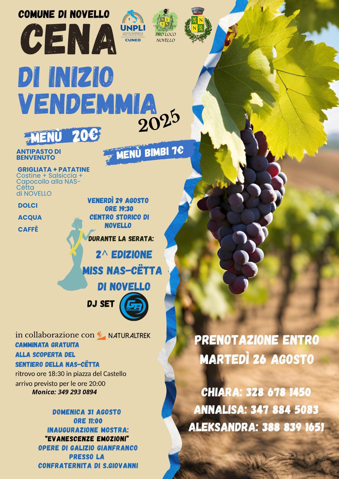 Novello si sta preparando a vivere un fine settimana di festa all’insegna della convivialità, della tradizione e dell’arte. La Cena di inizio vendemmia, giunta alla sua seconda edizione, è in programma per venerdì 29 agosto nel cuore del paese, organizzata dalla Pro Loco con il patrocinio comunale.