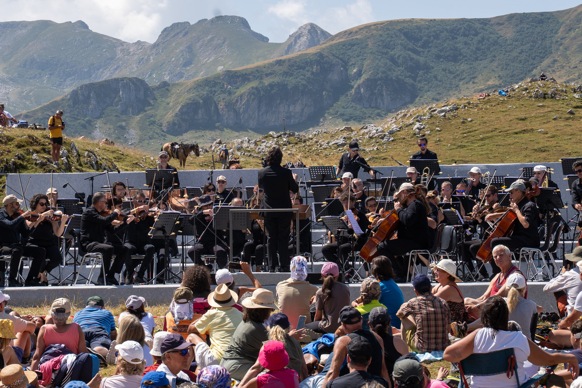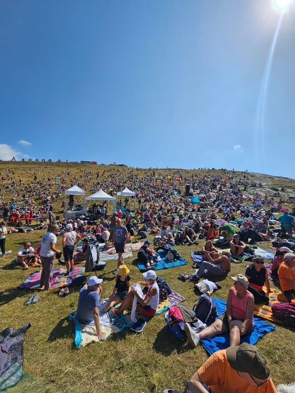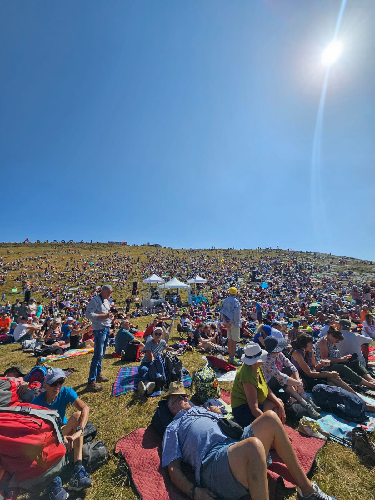 Il sole di Ferragosto illumina l’Alpet Balma di Prato Nevoso, nel comune di Frabosa Sottana, trasformata in un anfiteatro naturale affacciato sulle Alpi Liguri. Sul prato, coperte, cappelli di paglia, zaini e sorrisi compongono un mosaico di colori, mentre migliaia di persone si lasciano avvolgere dalle note dell’Orchestra Bartolomeo Bruni di Cuneo. L’atmosfera è festosa e carica di attesa: gli organizzatori sorridono, convinti di un afflusso da primato.