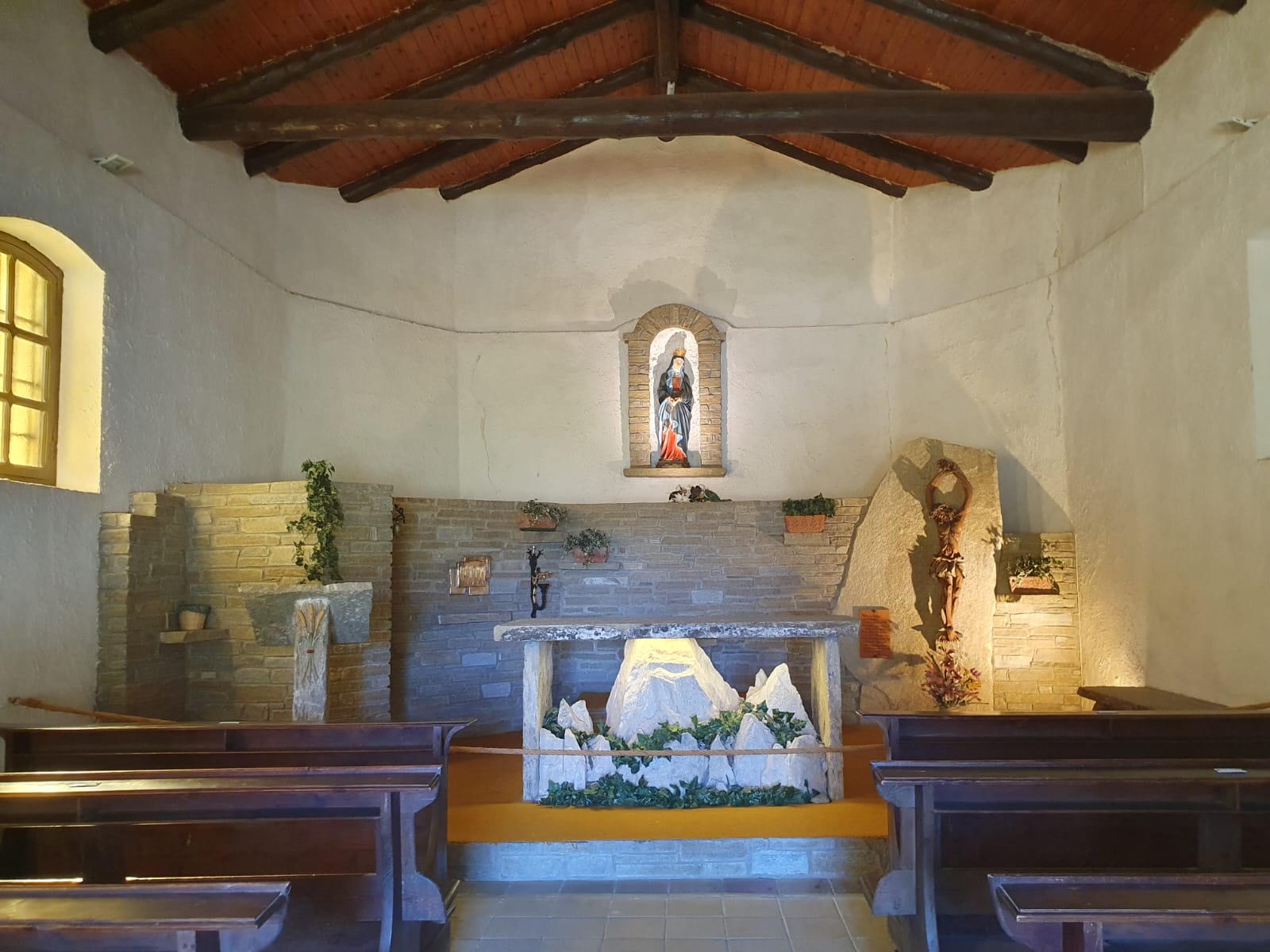 Nella chiesetta dedicata alla Madonna si trova un altare sorretto da un blocco di granito bianco scolpito a forma di Monviso da Giovanni Genre, ideatore oltre sessant’anni fa del rifugio di Pian della Regina, scomparso lo scorso gennaio all’età di 89 anni.
