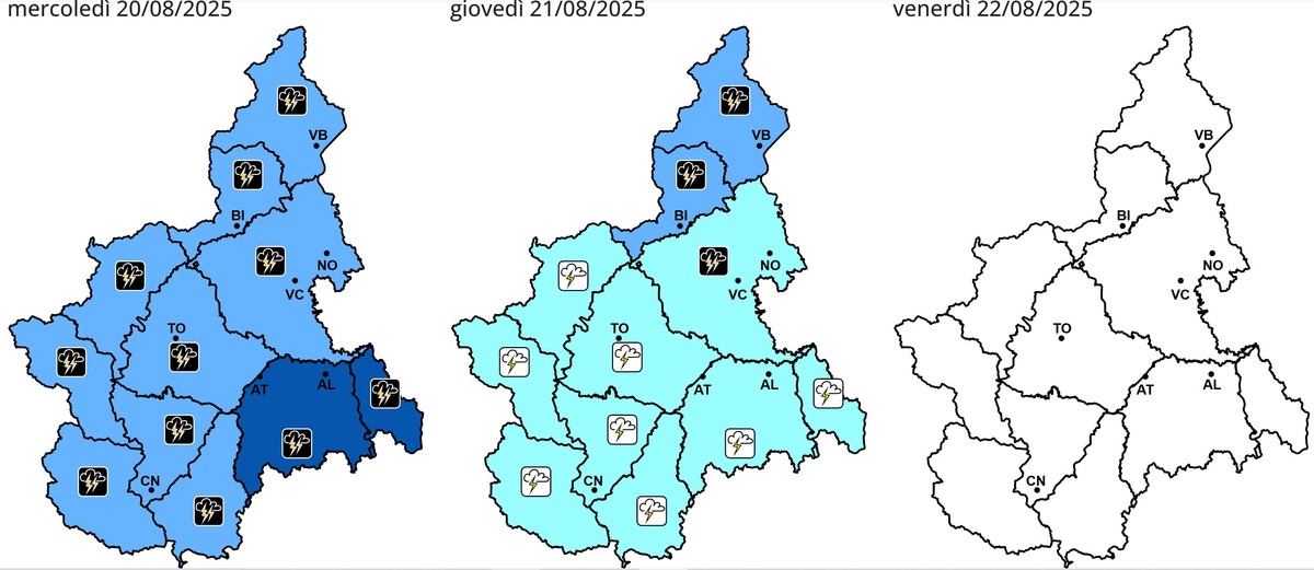 La dinamica meteorologica prevede un graduale esaurimento dei fenomeni dalla tarda serata, a partire dalle zone occidentali. Tuttavia, sono attesi nuovi temporali intensi sull'alto Piemonte che persisteranno fino alla mattinata di domani, giovedì 21 agosto.