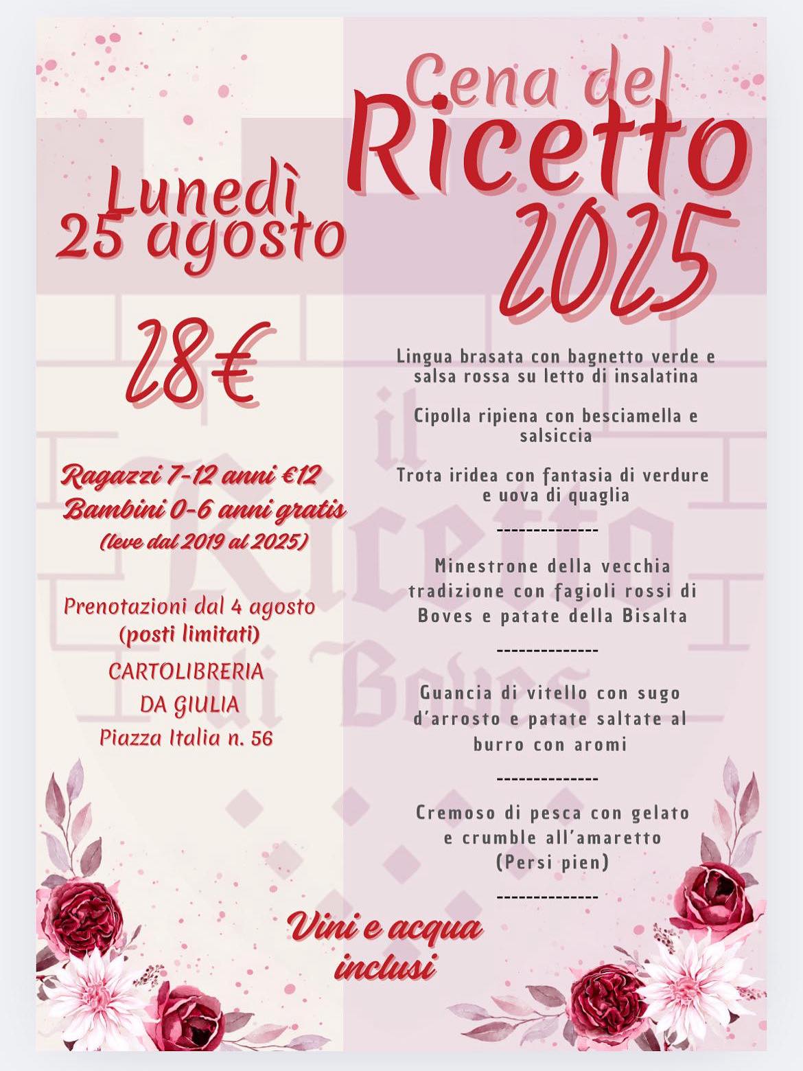 Lunedì 25 agosto a partire dalle ore 20:00, in piazza Italia, inizierà la grande Cena del Ricetto, resa possibile grazie alla presenza di centinaia di volontari che ogni anno si mettono a disposizione della comunità per dar vita ad un evento unico nel suo genere.
