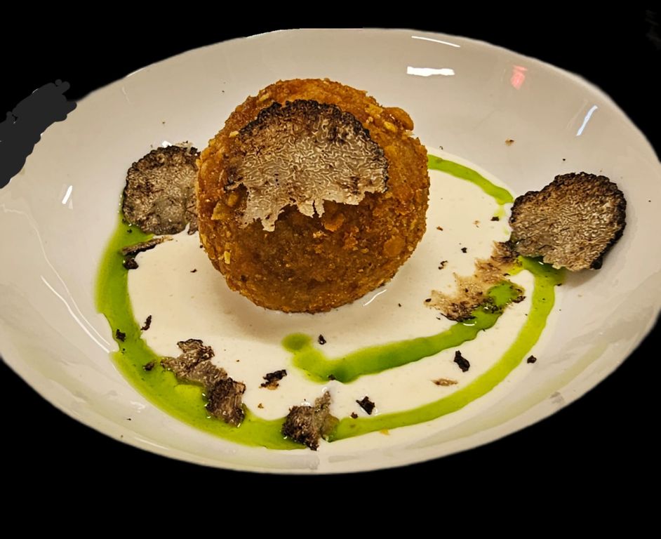 Visivamente elegante e al tempo stesso golosa, la polpetta ha racchiuso in sé un cuore ricco di gusto, con la carne di Razza Piemontese, resa tenera da una cottura sapiente e rivestita da una panatura dorata e fragrante. La fonduta di Toma piemontese ha aggiunto rotondità e cremosità. L’olio di taggiasca aromatizzato al prezzemolo ha portato in tavola la Liguria, con una nota verde e fresca che ha bilanciato la ricchezza del piatto. Infine, il tartufo nero estivo, ha avvolto il tutto con i suoi profumi complessi e le sue venature aromatiche, rendendo ogni boccone un viaggio multisensoriale.