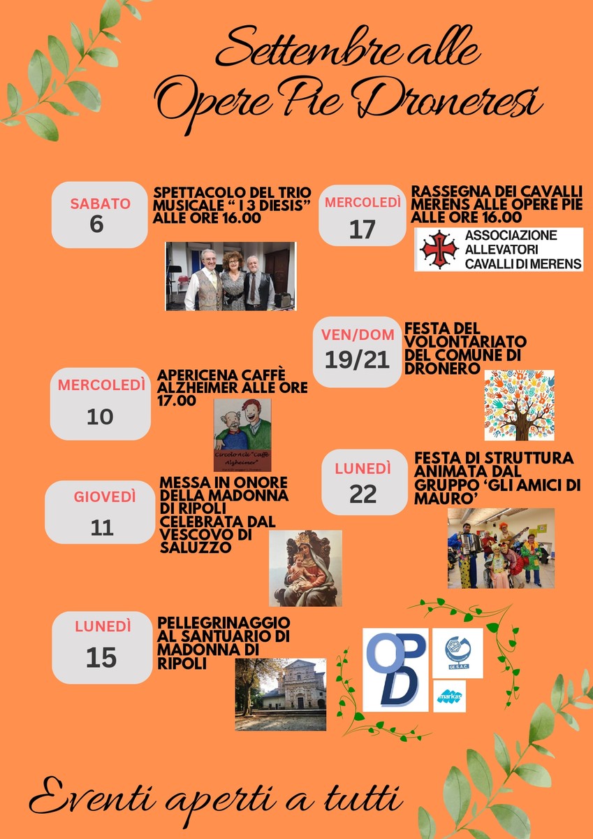 Si partirà sabato 6 settembre con lo spettacolo del trio musicale “I 3 DIESIS”, un graditissimo ritorno dopo il gran successo in occasione della “Giornata dei Balocchi” dello scorso 31 maggio. Seguirà l’apericena di mercoledì 10 con gli amici del “Caffè Alzheimer” che presenteranno le attività 2025-2026 che le Opere Pie Droneresi hanno l’onore e la fortuna di ospitare presso i locali della loro Struttura.