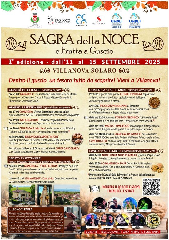 Ma non basta: la prima edizione della Sagra della Noce e della Frutta a Guscio di Villanova Solaro rappresenta anche una piccola sfida per buona parte delle Pro loco del circuito di Octavia, l’associazione di Comuni della pianura saluzzese. Sì, perché quelli che sono i gli alfieri del gusto (e che da anni promuovono alcune eccellenze culinarie diventate dei “must”, si pensi alla bagna caoda o al fritto misto) saranno coinvolti nella rassegna con un doppio appuntamento dal titolo “Mangirula”: il giovedì che apre il sipario ai festeggiamenti in una sfida di cucina tra i provetti cuochi del circondario (una sorta di “Masterchef” in salsa villanovese, collegato all’omologa gara di Scarnafigi); sabato dando vita ad un’Arena del Gusto in piazza, con possibilità per il pubblico di gustare un menu completo, dall’antipasto al dolce, in versione street-food.