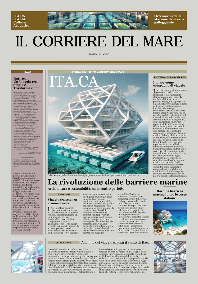 In questo contesto si inserisce ITA.CA – Barriere marine abitative per il futuro delle coste del Mediterraneo, il progetto firmato dallo Studio 3Mark e selezionato per il Padiglione Italia. L’idea nasce come una riflessione visiva sul paesaggio costiero italiano, raccontata in modo inusuale: la prima pagina di un quotidiano “fittizio” ma dalle dimensioni reali, che diventa un prototipo narrativo e visivo per un’iniziativa concreta. Il giornale non riporta l’anno, ma solo giorno e mese, a indicare un tema senza tempo, valido ieri, oggi e domani.