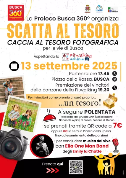 Sabato 13 settembre 2025, la Pro Loco Busca 360° organizza Scatta al Tesoro, una divertente caccia al tesoro fotografica per le vie del centro. Ritrovo e partenza alle ore 17.45 in Piazza della Rossa: armatevi di fotocamera o smartphone: ogni tappa sarà una sorpresa e, per i vincitori, il premio finale sarà… un vero tesoro! Alle 19.30 premiazione dei vincitori della canzone della Fitwalking.